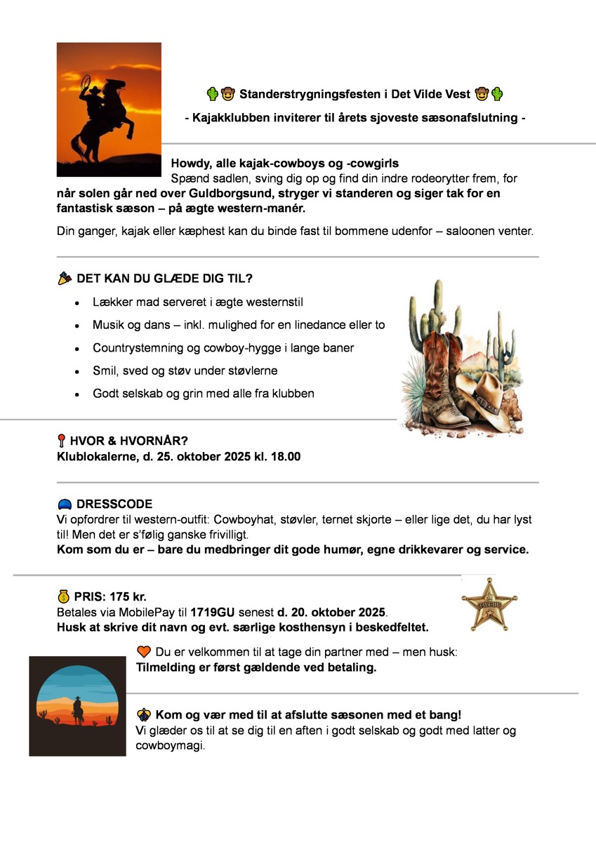 Howdy, alle kajak-cowboys og -cowgirls Spænd sadlen, sving dig op og find din indre rodeorytter frem, for når solen går ned over Guldborgsund, stryger vi standeren og siger tak for en fantastisk sæson – på ægte western-manér.
